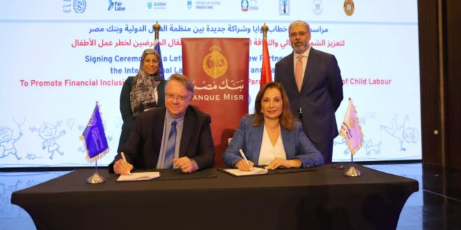 في اطار خطة بنك مصر لدعم جهود الدولة لتعزيز الشمول المالي والقضاء على عمل الأطفال، قام البنك مؤخرا بتوقيع بروتوكول تعاون مع منظمة العمل الدولية ، وذلك ضمن إطار مشروعات المنظمة لمكافحة عمل الأطفال،حيث قامت الأستاذة /هند فهمى – رئيس قطاع الشمول المالي والتمويل العقاري ببنك مصر بتوقيع بروتوكول التعاون مع الأستاذ/ إيريك أوشلان- مدير مكتب منظمة العمل الدولية بمصر، وقد حضر التوقيع لفيف متميز من قيادات بنك مصر ومنظمة العمل الدولية وممثلي السفارة الإيطالية و سفارة سلوفينيا بجمهورية مصر العربية.