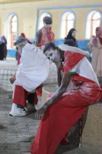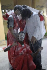 يُعرض العمل تحت عنوان العائدون من تحت الركام ضمن عروض مسرح الشارع التي تعالج قضايا الذاكرة والصراعات النفسية والاجتماعية الناشئة بعد الحروب. يركز العرض على استمرارية المقاومة والنضال الفلسطيني، ويسائل المفاهيم الفلسفية المتعلقة بالعدالة والسلام وصمت العالم تجاه المآسي الإنسانية. كما يسلط الضوء على التناقضات بين الخير والشر داخل الفرد والمجتمع
